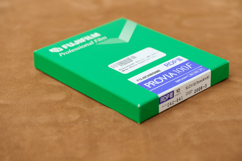 Unopened 10-sheet 4x5 box of Fujichrome Provia 100F. Best before March 2006.